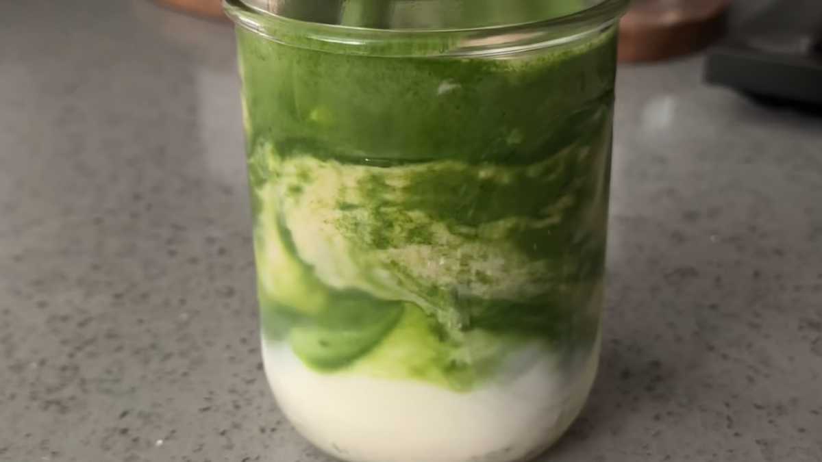 - Slowly pour the matcha over the milk using a spoon to create a layered effect.