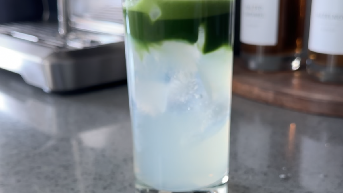 - Slowly pour the matcha over the lemonade using a spoon to create a layered effect.